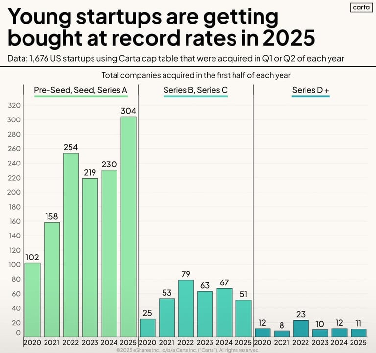 According to data from Carta, the number of early-stage companies being acquired at the “Pre-Seed,” “Seed,” and “Series A” levels has nearly tripled compared to pre-pandemic years.